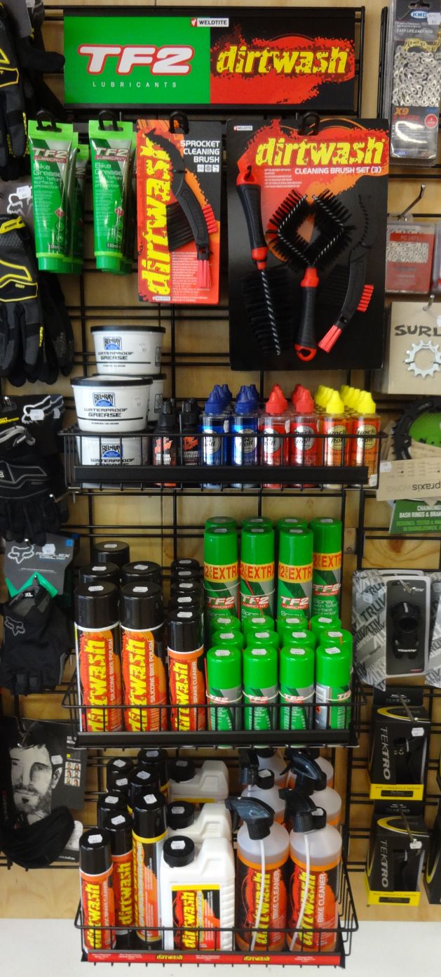Weldtite make some great lubes and cleaners for bikes, including some powerful citrus degreaser, the fantastic (in moderation) TF2 Teflon spray lube, Teflon grease, Bike wash spray and various brushes. We also keep Triflow lube for chains, cables and pivots, and Rock’n’Roll wax lubes.
