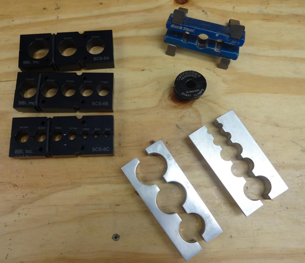 Their manufacturing tolerances must be spot on in order to do the job right. The clamp is fixed into a vice and often has magnets relieved into the back to make things easier – or like the black BBI clamps and Cannondale clamp, uses O rings to hold the assembly together while out of the vice.